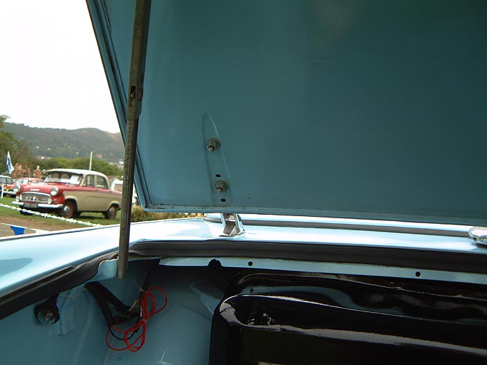 4VC im heutigen Zustand | Modifizierte Kofferklappe (nachträglich eingebrachte Scharnierpressung) | Inneneinrichtung mit Sitzen von 1962 und späteren Teilen | Blick in den Motorraum von 4VC | Modernes neues Typenschild |